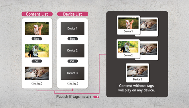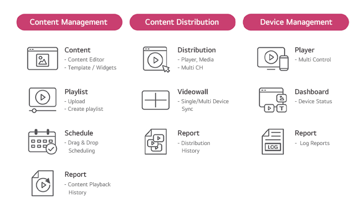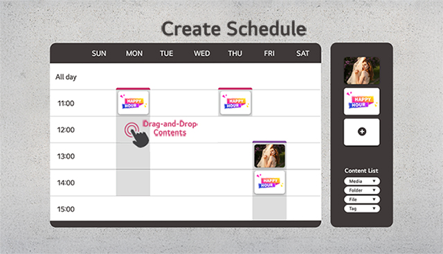 LG SuperSign CMS makes it very simple for the users to distribute content on their signage displays using drag & drop schedule, tags match, and videowall sync to multi signage simultaneously.