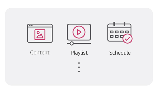 * LG SuperSign CMS provides a service that works with external content (Streaming, Web page, Web video, etc.), and external content is not included in the solution.