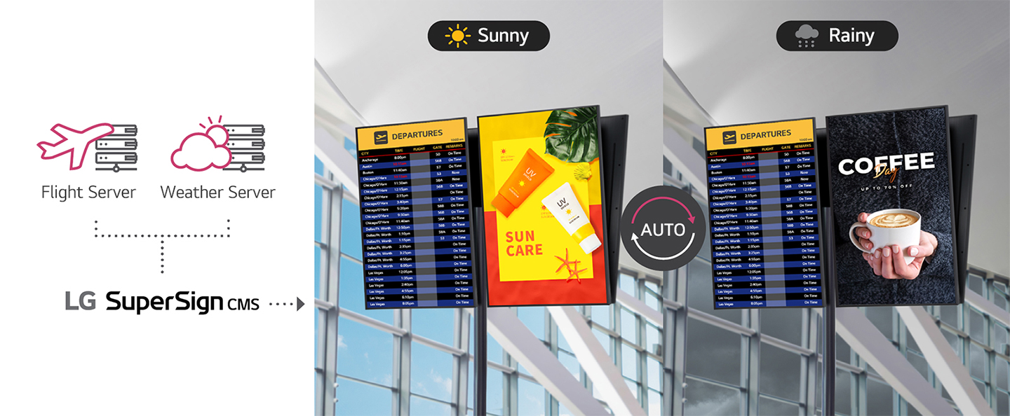 LG SuperSign CMS can connect to external databases, allowing for real-time data to be displayed in conjunction with SuperSign content. This feature is particularly useful for displaying information such as weather conditions or flight status updates, which can be updated automatically and displayed in real-time.