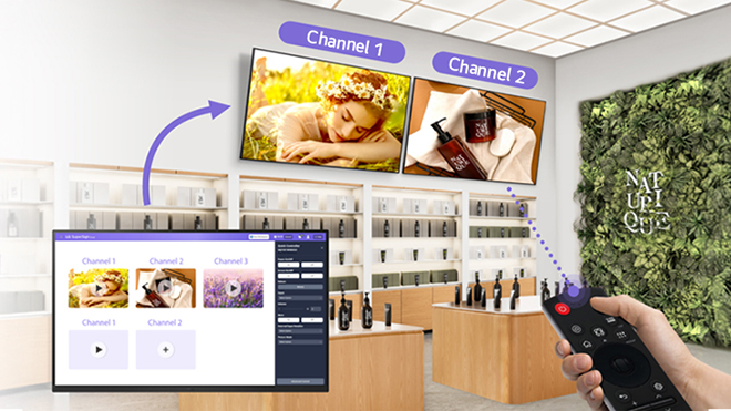 Assign desired channel numbers to content items and control playback on signage with a remote control.